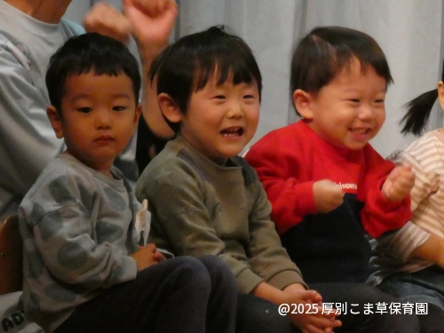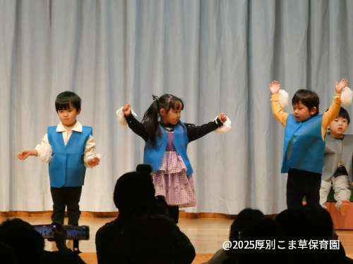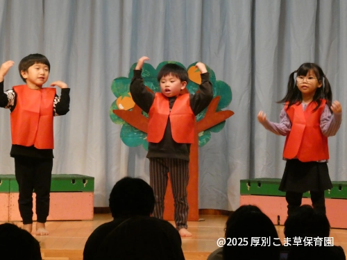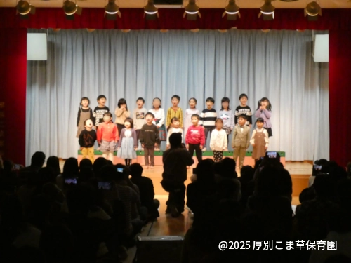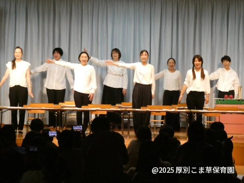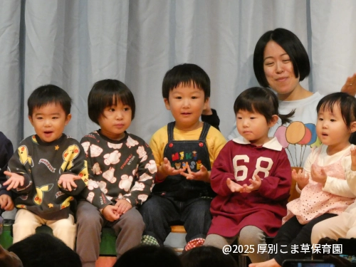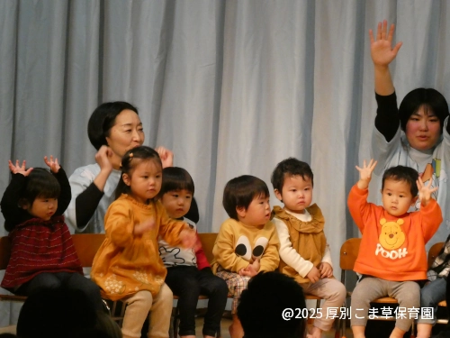 令和7年11月8日(土)、園舎2階大ホールにおいて「第44回厚別こま草保育園生活発表会」を開催しました。今年度も運動会と同じく前半・後半に分けて行い、前半は1歳児・2歳児、後半は3歳以上児の子どもたちが、日常保育の中で親しんできた歌やオペレッタを披露しました。